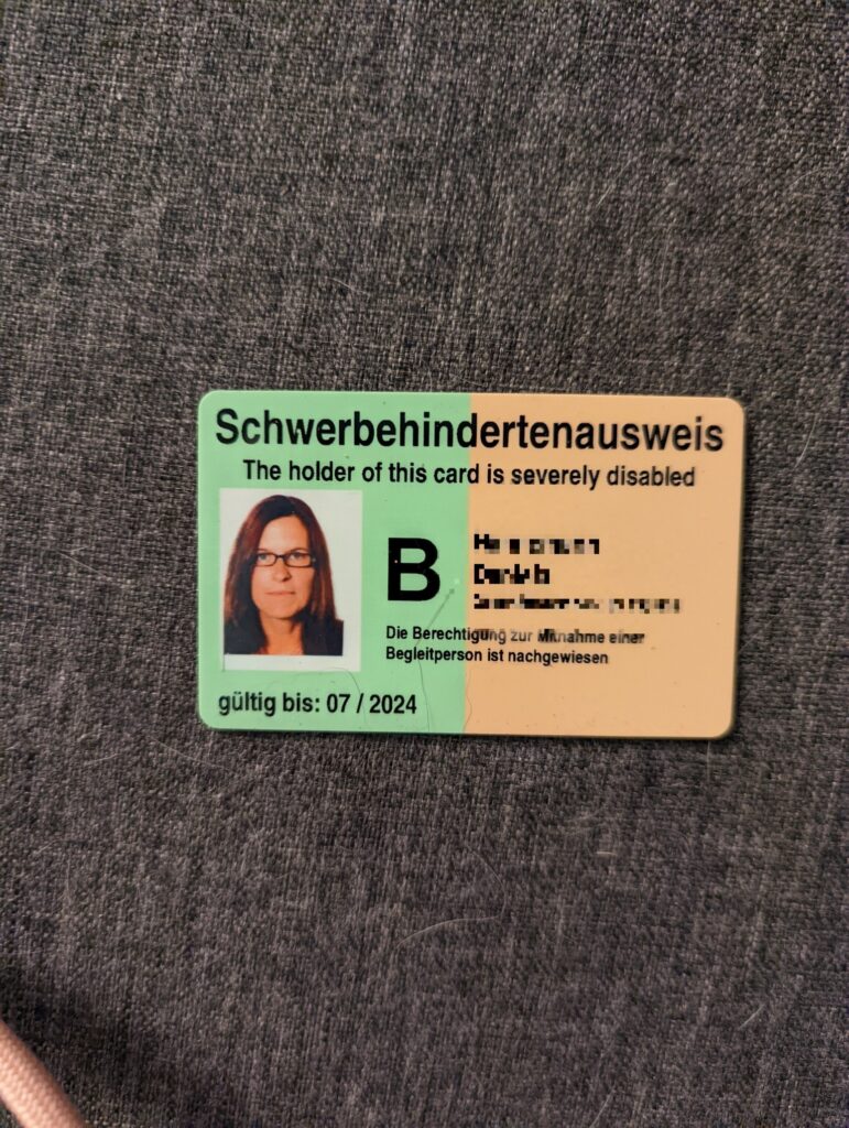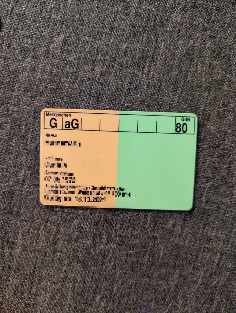 oder manchmal braucht es auch zwei andere Farben, damit ich verstehe, wie es wirklich um mich steht. Als man die Diagnose bei mir entdeckte und ich meinen ersten Schwerbehindertenausweis bekam, stand dort ein GdB von 60 und die Merkmale G und B. Die 60 stehen für den Schwerbehindertengrad und die Buchstaben stehen für B= mit Begleitung und G= Gebehindert. Ich weiss noch wie mir am Anfang die Tränen runterkullerten, als ich den Schwerbehindertenausweis sah und was da alles drauf stand. Zwei Jahre später musste ich wieder einen Antrag ausfüllen, damit ich meinen Schwerbehindertenausweis wieder zugesprochen bekomme. Ich bekam ihn wieder, auf dem Antrag muss man auch alle Ärzte aufschreiben, zu denen man regelmäßig geht und das tat ich auch und ich schrieb noch all die anderen Ärzte auf, die mich untersucht hatten. es dauerte wieder zwei bis drei Monate bis ich den Brief in meinem Briefkasten hatte. Beim zweiten Mal flossen allerdings keine Tränen mehr, denn nach den Jahren hatte ich mich schon viel besser informiert gehabt und war nicht mehr so voller Hoffnung, dass irgendwann der Tag X kommen wird wo ich wieder lustig durch die Gegend springen werde 😉 Nein, mir war nach so langer Zeit klar, dass CRPS nun einmal eine unheilbare Krankheit ist, wenn man zu Anfang nicht sofort alles richtig macht. Aber mein Gesundheitszustand hatte sich in den zwei Jahren wieder verschlechtert gehabt. Die Buchstaben blieben die selben, wie die Jahre zuvor dort schon standen, allerdings hatte sich der GdB verschlechtert, ich hatte keine 60% Schwerbehindertengrad mehr, sondern einen GdB von 70%! Wow, das war und ist schon eine andere Hausnummer, tja und im lezten Jahr musste ich wieder einen neuen Antrag stellen, denn ich wollte endlich einen Behindertenparkplatz bekommen. Tja und wie ich es ja schon in meinem letzten Beitrag geschrieben hatte, war es dieses Jahr endlich soweit, ich bekam ihn aber oha, mein Sxhwerbehindertengrad hatte sich auch wieder verschlechtert gehabt, jetzt ist er auf 80 hoch, die beiden Merkmale G und B blieben aber ganz neu kam das aG hinzu, was für: außergewöhnliche Gehbehinderung steht. Ich muss allerdings sagen, dass die 80% GdB schon schockierte da es sich bei mir nur um das CPRS handelt und keine weitere Erkrankung hinzu kommt dass noch hinzu gefügt werden könnte. Da habe ich nichts weiteres, ich habe „nur“ CRPS.