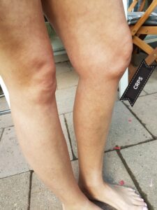 Auf dem Bild links neben dem Text könnt ihr mein Bein sehen, wo Herr Sudeck eingezogen ist. Dieses Bild entstand am 22. Juni 2017. Das Bild entstand nach meinem letzten Arbeitstag. Vom 14. November 2016, der Tag nach meiner Knie Arthroskopie bis zu diesem Tag, versuchte ich auf Biegen und Brechen, dass mein Knie doch noch wieder in Odnung kommt und ich wieder durchstarten kann und alles wieder so wird, wie es einmal war. Leider ist dieser Wunsch bis heute ausgeblieben, denn Herr Sudeck ist bis heute bei mir geblieben. 😥 Auf dem Bild kann man erkennen, wie geschwollen mein Knie und mein ganzes Bein ist, wenn man genau hinschaut kann man auch erkennen, wie die Haut glänzt. Ich hatte mein Bein nicht eingecrémt gehabt, es ist ein Symptom von Herrn Sudeck, so zeigt er sich, dass er in einem steckt. 😔