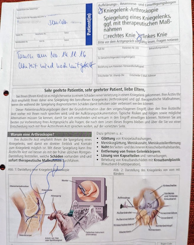 Am Morgen des 28. Sept. 2016 bin ich, nachdem mein Wecker geklingelt hatte und nach mehreren Recken und Strecken, langsam aus dem Bett gekrochen. Meine Beine berührten gerade den Boden, ich stand auf und auf einmal merkte ich, wie mir etwas den Boden unter den Füssen weg zog. Ich flog hin, spürte einen stechenden Schmerz in meinem linken Knie, wie es knackte und etwas zerriss. Ich schrie vor Schmerzen auf, hielt mein Knie fest, wälzte mich am Boden, wie ein Fußballer, der gerade gefault wurde. Mein Freund sprang aus dem Bett, rannte um das Bett herum, damit er zu mir kommen konnte und fragte nicht groß was los ist, sondern hob mich vorsichtig ins Bett hoch. Er holte kalte Wickel und legte sie mir aufs Knie. Langsam beruhigte sich der Schmerz. Wir fuhren, nachdem meine Kinder zur Schule gegangen waren, ins Krankenhaus. Es stellte sich heraus, dass nichts gebrochen war, zum Glück aber wie es im Innern des Knies ausschaute, dass wusste man zu diesem Zeitpunkt noch nicht. Ich brauchte ein MRT, da dies aber in diesem Krankenhaus nicht mehr möglich war, weil es kurz vor der Schließung stand, musste ich mir selber einen eigenen Termin in einer Radiologie Praxis holen. Im Krankhaus bekam ich dann noch eine Ganzbein-Orthese, so war das Knie geschützt. Wenn man so dörflich oder in einem Kaff wohnt wie ich es tue, ist es nicht einfach, mal eben schnell einen Termin für ein MRT zu bekommen.